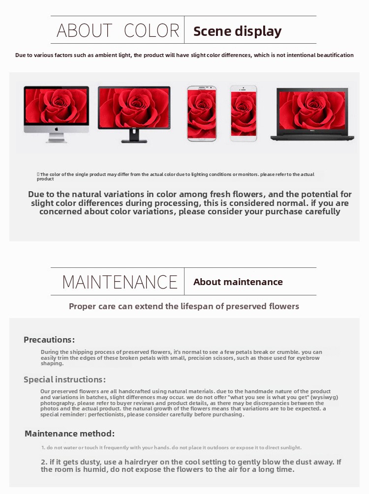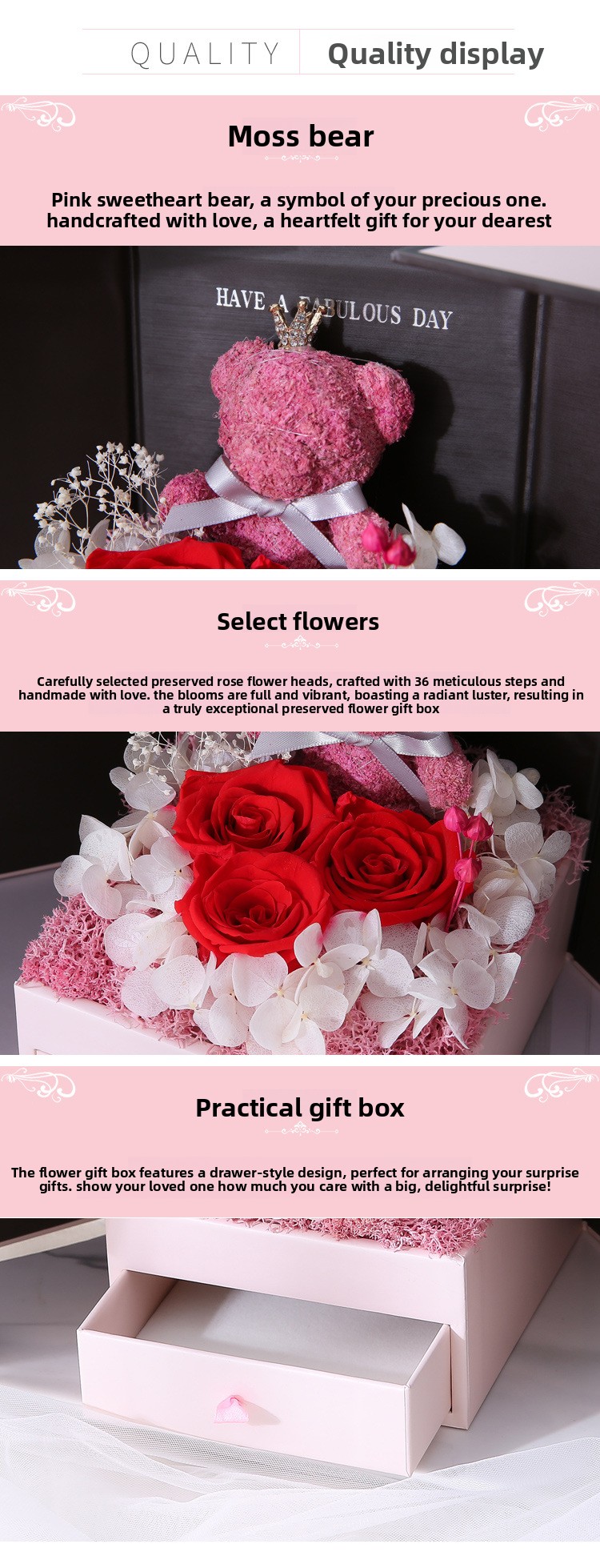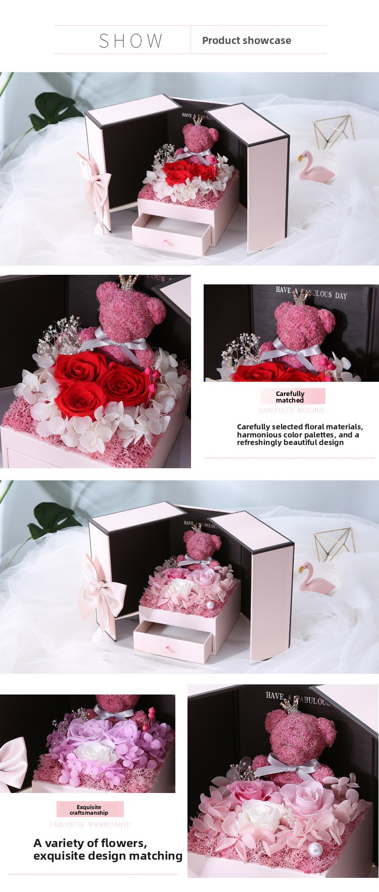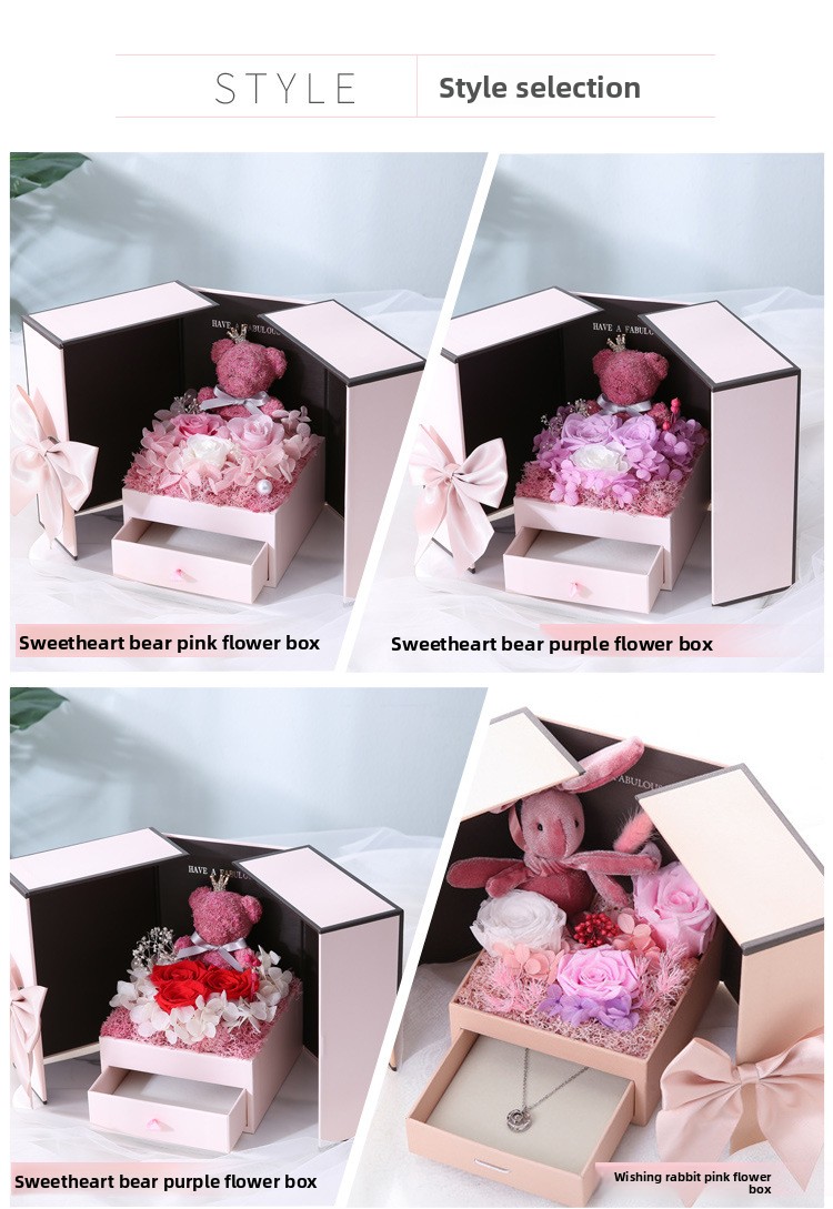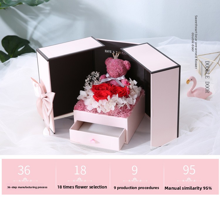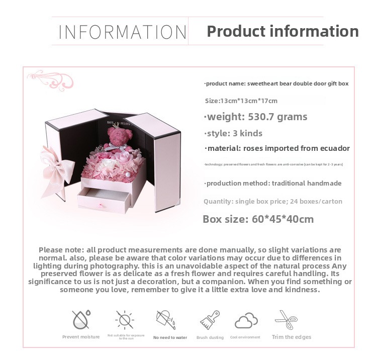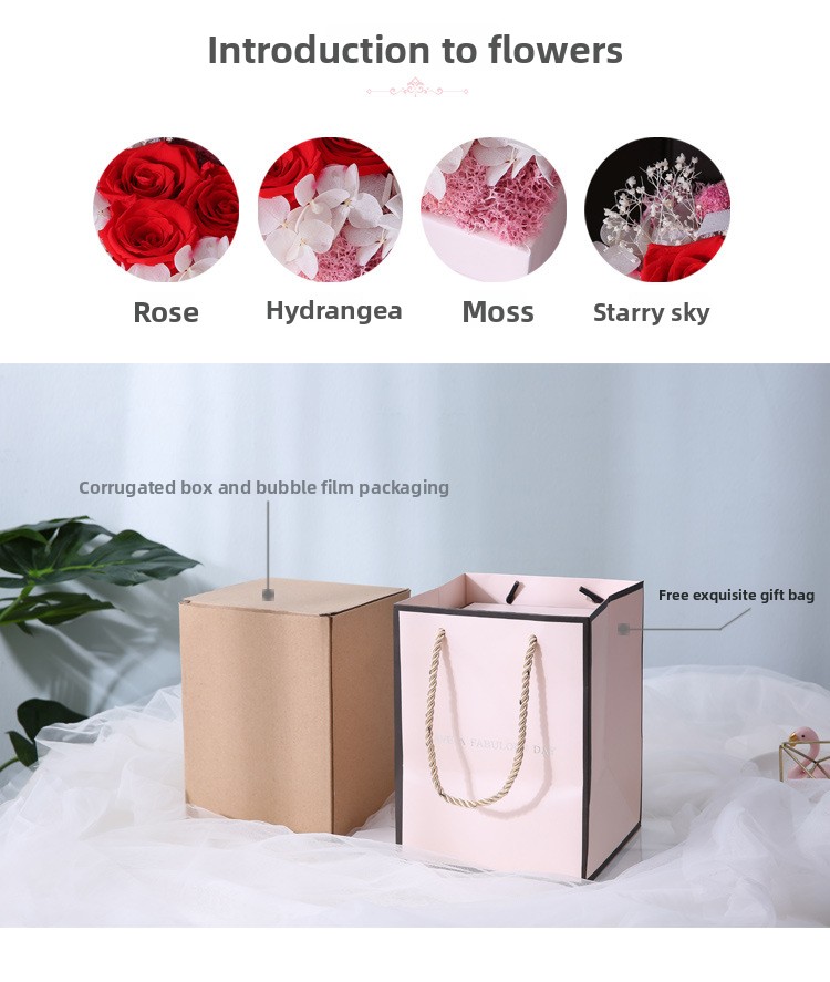 Material: Preserved roses, synthetic materials, cardboard/paper box